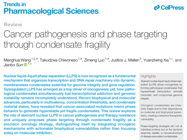 近日,av影片中文字幕 孙建博教授、王孟华教授和夏元铮副教授应邀在权威期刊 Trends in Pharmacological Sciences 上发表了题为 Cancer pathogenesis and phase targeting through condensate fragility 的综述论文。王孟华教授、2023级硕士生赤沃索和2025级硕士生罗梓萌为论文的共同第一作者,孙建博教授和夏元铮教授为通讯作者,av影片中文字幕 为论文的唯一通讯单位。